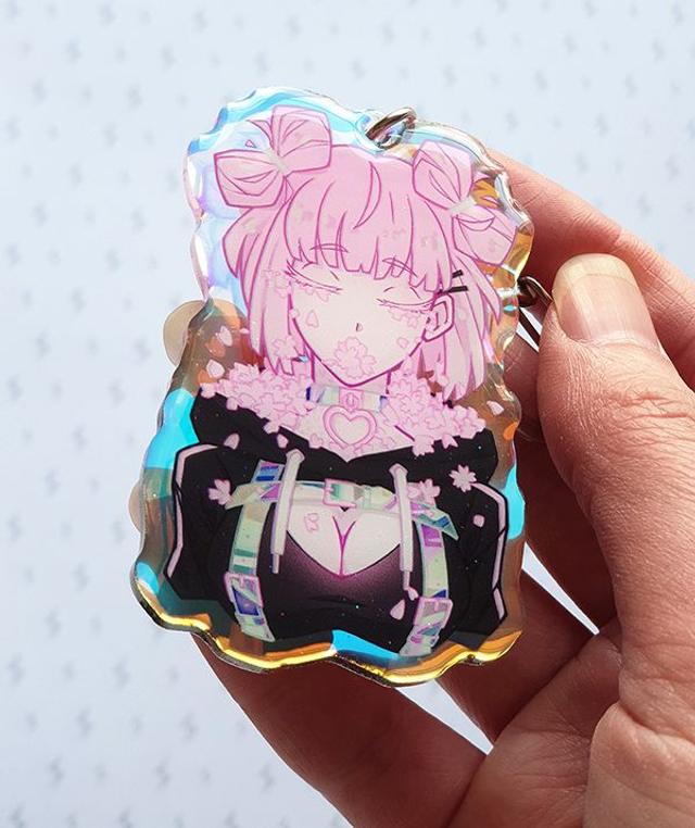 Front and back design printed on clear acrylic with clear epoxy on top and holo film on the back. The holo film gives that nice iridescent effect.