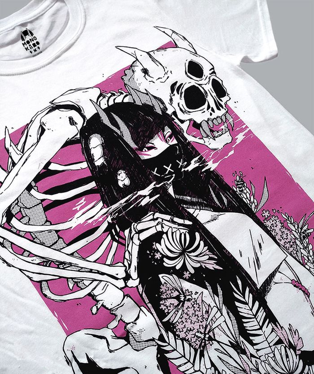 A comfy white t-shirt featuring an original design of Kimi and her skeleton boi ✖.
